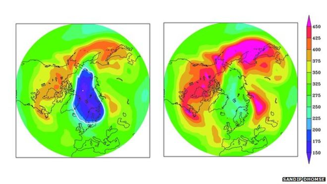 There would also have been a hole over the Arctic at times, which would have rivalled that of the Antarctic and would have affected northern Europe, including the UK.
