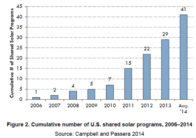 Community solar plays a small, though growing, part in the record amounts of solar that has come online in the U.S. in recent years. However that small part could expand dramatically. It has the potential to open up the market and make solar available to the remaining half of U.S. homes and businesses that cannot utilize on-site solar, according to NREL lead researcher and report author David Feldman. Shared solar can reduce the financial and technical barriers that prevent Americans who live in multi-tenant housing and businesses and residents who rent or lease rather than own property to share electricity produced by PV arrays that they may own, lease or otherwise share, according to the report. This will enable project developers to realize economies of scale by aggregating demand. Shared solar affords other substantial benefits that could spur wholesale adoption of solar PV across the U.S. Among these, the report authors point out that: