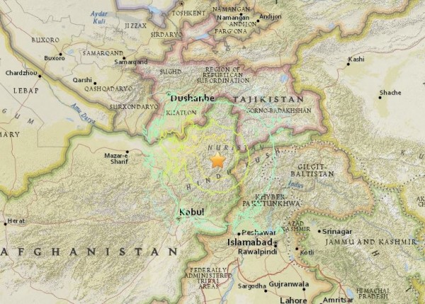 7.5-magnitude earthquake north-northeast of Kabul, October 26, 2015. Image via USGS. The U.S. Geological Survey has reported a 7.5-magnitude earthquake – an extremely powerful earthquake – which struck in in Afghanistan on Monday afternoon, October 26, 2015. The quake took place 158 miles (254 km) north-northeast of Kabul, Afghanistan at 1:30 p.m. in Kabul (9:10 UTC, 5:10 a.m. CDT at North American timezones). CNN reported that its teams in Afghanistan, India and Pakistan all felt strong tremors, and CNN’s producer in Kabul, Masoud Popalzai said: