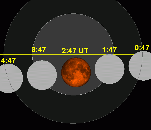 There is a total eclipse of the moon on the night of September 27-28, 2015. It happens to be the closest supermoon of 2015. It’s the Northern Hemisphere’s Harvest Moon, or full moon nearest the September equinox. It’s the Southern Hemisphere’s first full moon of spring. This September full moon is also called a Blood Moon, because it presents the fourth and final eclipse of a lunar tetrad: four straight total eclipses of the moon, spaced at six lunar months (full moons) apart. Phew! The total lunar eclipse is visible from the most of North America and all of South America after sunset September 27. From eastern South America and Greenland, the greatest eclipse happens around midnight September 27-28. In Europe, Africa and the Middle East, the total eclipse takes place in the wee hours of the morning, after midnight and before sunrise September 28. A partial lunar eclipse can be seen after sunset September 27 from western Alaska, or before sunrise September 28 in far-western Asia. Photo top of post shows a partial phase of the April 14-15, 2014 total lunar eclipse by Fred Espenak. Follow the links below to learn more about the 2015 Harvest Moon and the September 27-28 total lunar eclipse. When is the September 2015 moon exactly full? Who will see the September 27-28 total lunar eclipse? Who will see the partial lunar eclipse? Eclipse times in Universal Time. Eclipse times for North American time zones. Lunar eclipse computer courtesy of the US Naval Observatory Eclipse calculator courtesy of TimeandDate How is the Harvest Moon different from other full moons? ![]() View larger. | Who will see the September 27-28 lunar eclipse. This diagram from shadowandsubstance.com should help you determine if and how it’s visible from your location. Visit shadowandsubstance for lots more on the eclipse! Thank you, Larry Koehn! ![]() Animation of the September 28, 2015, total lunar eclipse. Moon passes through southern half of the Earth’s shadow from west to east. Horizontal yellow line depicts the ecliptic – Earth’s orbital plane projected onto the dome of sky. The inner bull’s-eye shadow depicts the umbra (dark shadow). The penumbra (faint shadow) encircles the umbra. ![]() Day and night sides of planet Earth at the instant of the September 2015 full moon (2015 September 28 at 2:51 Universal Time). You have to be on the night side of Earth to see the moon at the instant that it turns full, at which time it’ll be totally eclipsed by the Earth’s dark shadow. When is the September 2015 moon exactly full? Generally speaking, we can say the moon stays full all night on September 27-28. But, to astronomers, the moon turns full at a well-defined instant: when it’s opposite the sun in ecliptic longitude. That instant happens on September 28, 2015 at 2:51 UTC. At our U.S. time zones, that places the precise time of full moon on September 27 at 10:51 p.m. EDT, 9:51 p.m CDT, 8:51 p.m. MDT or 7:51 p.m. PDT. At that time, because there’s an eclipse happening, the moon will be totally submerged in the Earth’s dark umbral shadow. Meanwhile, because of the difference in time zones, this same full moon happens around local midnight (September 27-28) for Brazil and Greenland. It’s sunset (September 27) for far northeastern North America and it’s sunrise (September 28) in far-eastern Africa, the Middle East and European Russia. Watch the full-looking moon on the night of September 27-28 to rise in the east as the sun goes down. Like any full moon, the Northern Hemisphere’s Harvest Moon will shine all night long. It’ll soar highest in the sky around midnight and will set in the west around sunrise. EarthSky lunar calendars make perfect gifts for all ages ![]() View larger A lunar eclipse happens when the Earth, sun and moon align in space, with Earth in the middle. Why aren’t there eclipses at every full and new moon? Who will see the September 27-28 total lunar eclipse? The September 2015 full moon passes directly through Earth’s dark (umbral) shadow. The total part of this eclipse lasts for 72 minutes. A partial umbral eclipse precedes totality by some 64 minutes, and follows totality by about the same period of time, so the moon takes about 3 and 1/3 hours to completely sweep through the Earth’s dark shadow. North America, South America, the Atlantic Ocean, Greenland, Europe, Africa and the Middle East are in a good position worldwide to watch the total eclipse of the moon. If you live in the Americas, the total eclipse happens after sunset September 27. In the world’s eastern hemisphere, the total eclipse happens after midnight and before sunrise September 28. A very light penumbral eclipse comes before and after the dark (umbral) stage of the lunar eclipse. But this sort of eclipse is so faint that many people won’t even notice it. The penumbral eclipse would be more fun to watch from the moon, where it would be seen as a partial eclipse of the sun. Who will see the partial lunar eclipse on September 27? A partial lunar eclipse may be visible in the haze of evening dusk on September 27 from the extreme northwestern portion of North America (western Alaska). A partial lunar eclipse might also be observed in the haze of morning dawn (September 28) from far-western Asia (Pakistan, Afghanistan, eastern Iran). ![]() The moon moves from west to east across the Earth’s shadow. The horizontal yellow line depicts the ecliptic – Earth’s orbital plane projected onto the dome of sky. The greatest eclipse takes place on September 28, at 2:47 Universal Time (or for US time zones: September 27 at 10:47 p.m. EDT, 9:47 p.m. CDT, 8:47 p.m. MDT or 7:47 p.m. PDT). Click for eclipse computer Eclipse times in Universal Time. Partial umbral eclipse begins: 1:07 Universal Time (UT) How do I translate Universal Time to my time? Eclipse times for North American time zones. Atlantic Daylight Time (September 27, 2015) Eastern Daylight Time (September 27, 2015) Central Daylight Time (September