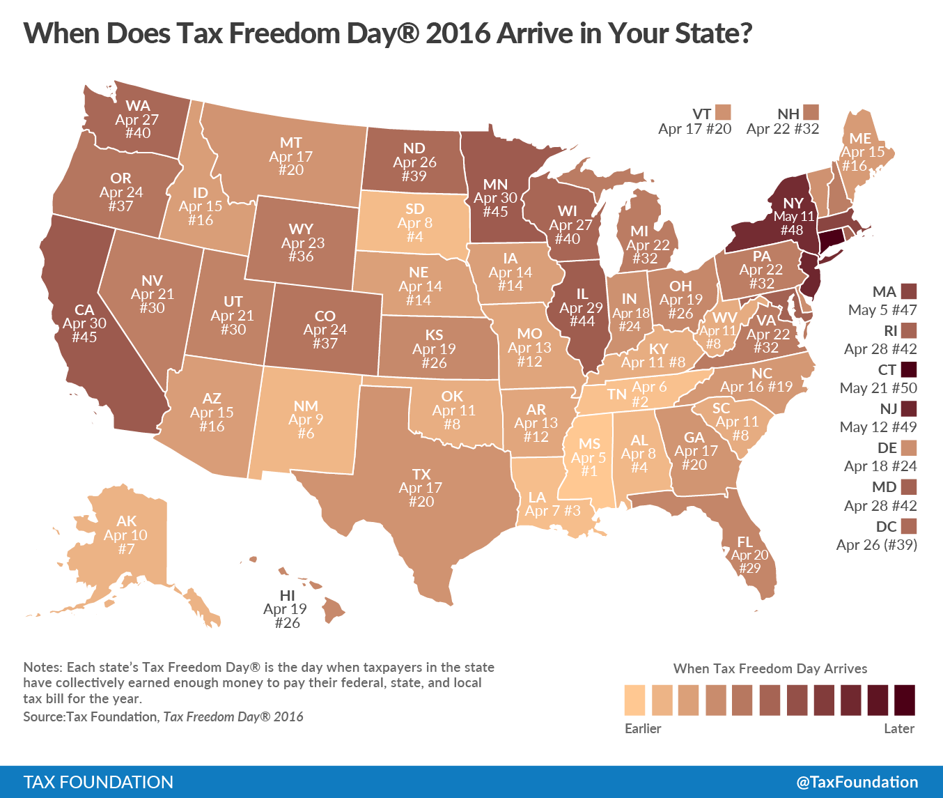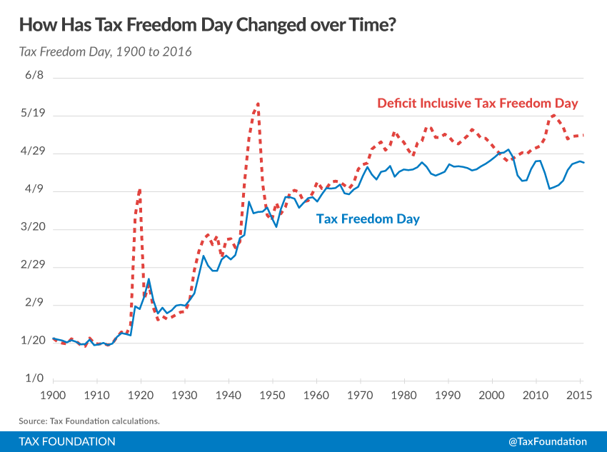 What Is Tax Freedom Day?Tax Freedom Day® is the day when the nation as a whole has earned enough money to pay its total tax bill for the year. Tax Freedom Day takes all federal, state, and local taxes and divides them by the nation’s income. In 2016, Americans will pay $3.34 trillion in federal taxes and $1.64 trillion in state and local taxes, for a total tax bill of $4.99 trillion, or 31 percent of national income. This year, Tax Freedom Day falls on April 24th, or 114 days into the year (excluding Leap Day). What Taxes Do We Pay?This year, Americans will work the longest to pay federal, state, and local individual income taxes (46 days). Payroll taxes will take 26 days to pay, followed by sales and excise taxes (15 days), corporate income taxes (nine days), and property taxes (11 days). The remaining seven days are spent paying estate and inheritance taxes, customs duties, and other taxes. Why Is Tax Freedom Day Earlier This Year?Tax Freedom Day is one day earlier than last year. This is due mainly to slightly lower projected federal tax collections, as a share of the U.S. economy. While federal individual income tax revenues are expected to rise as a share of the economy, federal corporate, payroll, and excise tax revenues are projected to fall. When Is Tax Freedom Day if You Include Federal Borrowing?Since 2002, federal expenses have surpassed federal revenues, with the budget deficit exceeding $1 trillion annually from 2009 to 2012. In calendar year 2016, the deficit will grow significantly, from $592 billion to $698 billion. If we include this annual federal borrowing, which represents future taxes owed, Tax Freedom Day would occur on May 10, 16 days later. The latest ever deficit-inclusive Tax Freedom Day occurred during World War II on May 25, 1945. When Is My State’s Tax Freedom Day?The total tax burden borne by residents of different states varies considerably due to differing state tax policies and the progressivity of the federal tax system. This means a combination of higher-income and higher-tax states celebrate Tax Freedom Day later: Connecticut (May 21), New Jersey (May 12), and New York (May 11). Residents of Mississippi will bear the lowest average tax burden in 2016, with Tax Freedom Day arriving for them on April 5. Also early are Tennessee (April 6) and Louisiana (April 7). How Has Tax Freedom Day Changed over Time?The latest ever Tax Freedom Day was May 1, 2000; in that year, Americans paid 33 percent of their total income in taxes. A century earlier, in 1900, Americans paid only 5.9 percent of their income in taxes, meaning that Tax Freedom Day came on January 22.