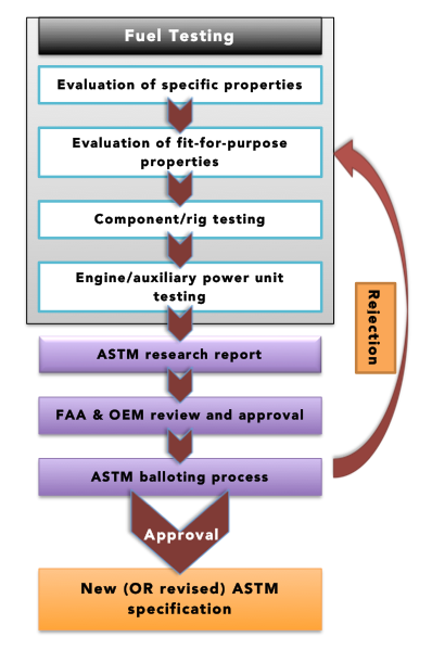 Synthetic jet fuels (including renewable) and blends are specified by standards ASTM D7566, established in 2009. Specific fuel blends certified for commercial use are added to the standard as an annex. These drop-in fuels are considered to be equivalent to conventional jet fuel (ASTM D1655) and can be mixed in aircraft and supply infrastructure without the need for separate tracking or approval. A further standard, ASTM D4054, provides guidance on the testing and property targets necessary to evaluate a candidate alternative fuel. Biofuel producers wishing to certify their product must collate the data required by D4054 in a research report and submit this to engine and airframe manufacturers (original equipment manufacturers, OEMS) for review. If the fuel is approved by the OEMs it is balloted to the ASTM’s membership for approval to develop an annex to D7566, Exhibit 1.