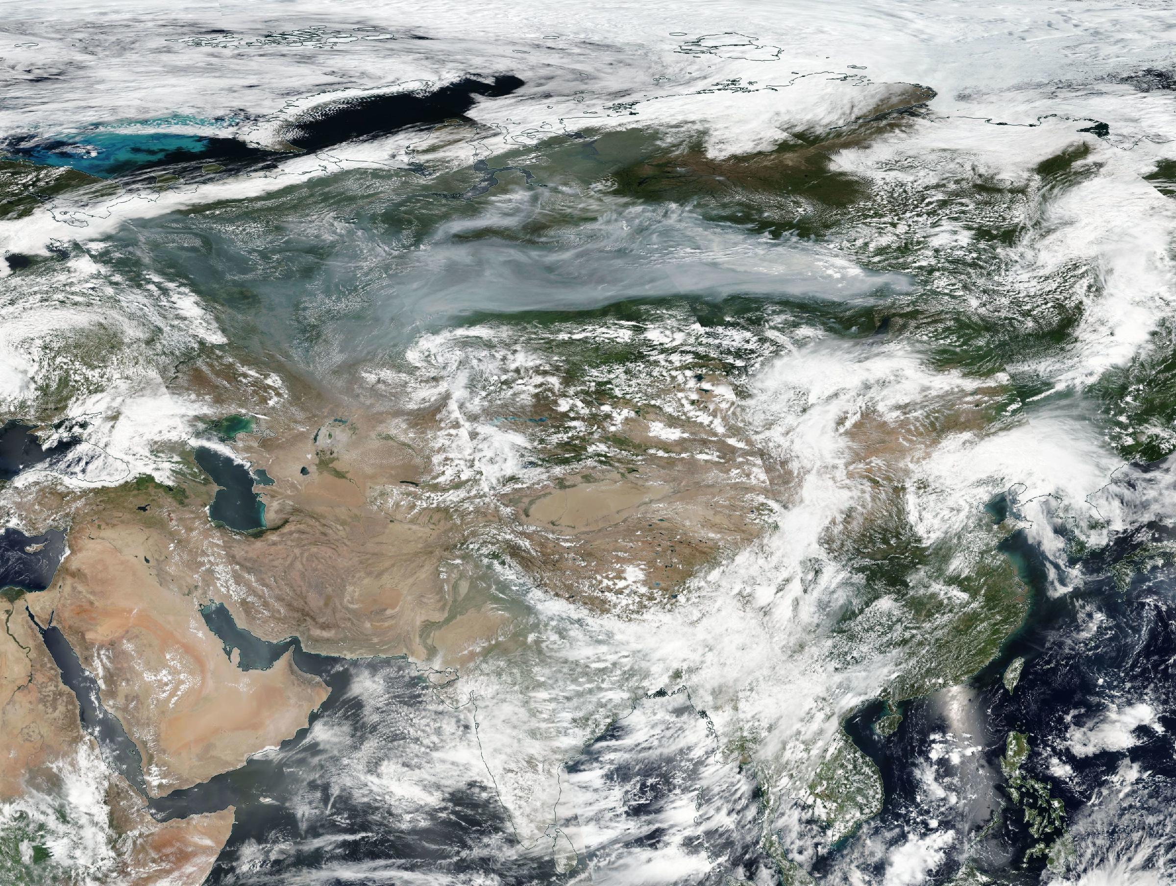 Most of Asia is visible in this image from the Suomi NPP spacecraft on July 21, 2016. Smoke from wildfires in Siberia extends across at least 2,000 miles of Russia from west to east. Suomi NPP orbits 512 miles from Earth. (Source: NASA Worldview)
