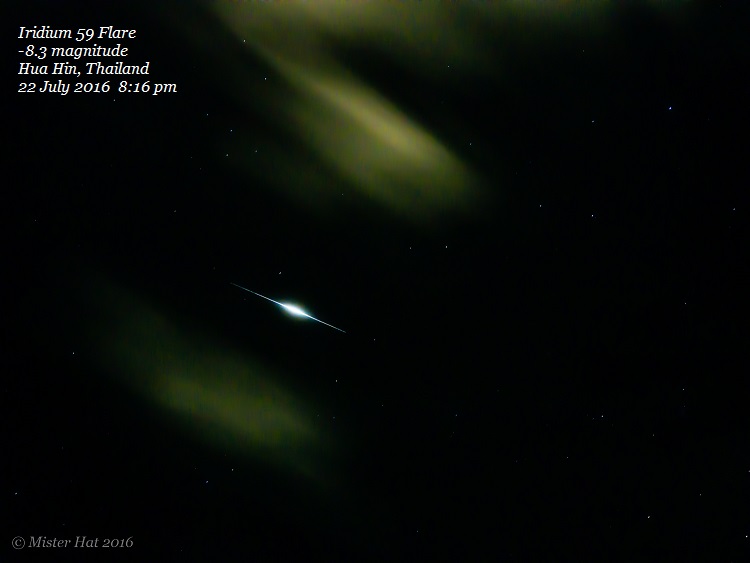 Large, round objects in the sky can be strange-looking. They may not appear to be moving. Different types of balloons and globes are being launched by various groups trying to do various things – for example, study Earth’s weather or atmosphere – and although these objects are slowly drifting on the wind, their distance from an observer might cause them to appear stationary in the sky. An example is Google’s Project Loon, listed by MIT Technology Review as one of 10 breakthrough technologies of 2015. Project Loon is launching a network of globes to test internet coverage with the goal to provide access to remote areas. They can gain an altitude of 60,000 feet (18,300 meters) or twice as high as commercial aircraft. Those balloons are reflective, and they appear bright in the sky. They can cause reports of UFOs sightings. ![]() Vince Babkirk captured this flare from an iridium satellite on July 22, 2016. He wrote: “There were lots of fast moving clouds tonight, but the Iridium 59 satellite was supposed to appear … [the clouds] parted just in time for me to capture the flare.” Read more about iridium flare satellites. Earth-orbiting satellites. Satellites are easily visible to the unaided eye one or two hours before sunrise and after sunset. We see them then because their high-altitude orbits let them receive and reflect sunlight, even if it is dark at the observer’s site. Satellites generally appear as slow-moving “stars” that may disappear as they pass into Earth’s shadow. Some satellites, including the Hubble Space Telescope, sometimes reflect sunlight in an optimum way for a brief time, causing a bright flash or flare. Iridium satellites, which provide cellular communications to remote areas, have very reflective antennas that produce very intense flashes as bright as -8 magnitude! That’s much brighter than the brightest planet, Venus. It’s bright that it might appear as a huge spotlight from up there for one or two seconds. Some satellites orbit in groups of two or three, as seen in this video: