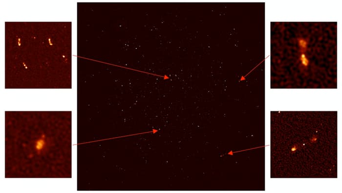 Each white dot in the MeerKAT First Light image represents a galaxy in the distant universe. In one corner, scientists are able to point out a "Fanaroy-Riley Class 2" object, a massive black hole that's spewing jets of electrons at a rate approaching the speed of light. The entire image covers an area less than 0.01 percent of the celestial sphere.
