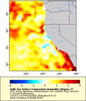 New research based on ocean models and near real-time data from autonomous gliders indicates that the "The Blob" and El Niño together strongly depressed productivity off the West Coast, with The Blob driving most of the impact. The research published in the journal Geophysical Research Letters by scientists from NOAA Fisheries, Scripps Institution of Oceanography and University of California, Santa Cruz is among the first to assess the marine effects of the 2015-2016 El Niño off the West Coast of the United States. "Last year there was a lot of speculation about the consequences of 'The Blob' and El Niño battling it out of the U.S. West Coast," said lead author Michael Jacox, of UC Santa Cruz and NOAA Fisheries' Southwest Fisheries Science Center. "We found that off California El Niño turned out to be much weaker than expected, The Blob continued to be a dominant force, and the two of them together had strongly negative impacts on marine productivity." "Now, both The Blob and El Niño are on their way out, but in their wake lies a heavily disrupted ecosystem," Jacox said. Unusually warm ocean temperatures that took on the name, The Blob, began affecting waters off the West Coast in late 2013. Warm conditions -- whether driven by the Blob or El Niño -- slow the flow of nutrients from the deep ocean, reducing the productivity of coastal ecosystems. Temperatures close to 3 degrees C (5 degrees F) above average also led to sightings of warm-water species far to the north of their typical range and likely contributed to the largest harmful algal bloom ever recorded on the West Coast last year. "These past years have been extremely unusual off the California coast, with humpback whales closer to shore, pelagic red crabs washing up on the beaches of central California, and sportfish in higher numbers in southern California," said Elliott Hazen of the Southwest Fisheries Science Center, a coauthor of the paper. "This paper reveals how broad scale warming influences the biology directly off our shores." Read more at ScienceDaily Image: A close-up of sea surface temperatures off the West Coast, with red illustrating areas warmer than average and blue representing areas below average via NOAA 2016©. Copyright Environmental News Network |
