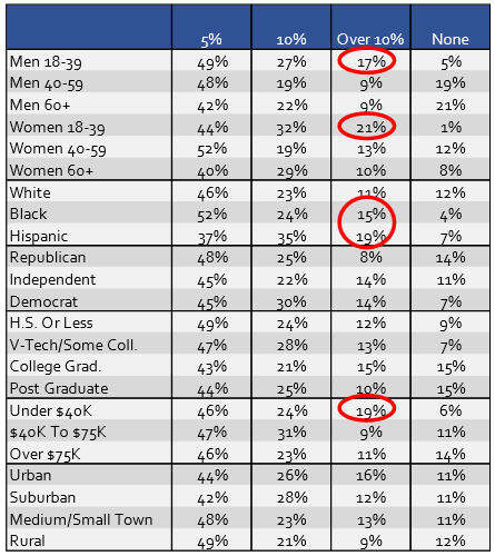 Surprising Facts From The 'Value Of Water' PollYou may have seen the recent poll results announced by the Value of Water Coalition indicating near universal agreement (95 percent) on the need for reliable water systems, along with the somewhat surprising fact that a majority (60 percent) would agree to higher water bills to support them. The real surprise, however, is who is willing to pay the most. The full report reveals that the lowest income earners, those making less than $40,000 annually, are ready to take a bigger financial hit for the sake of water infrastructure than higher-earning respondents. Note in the table below that 19 percent, as compared to 9 percent for the middle income bracket and 11 percent for the highest earners, would be willing to increase their water bill by more than 10 percent. Table 1. How Much More Are You Willing To Pay?
