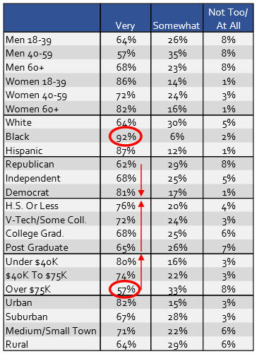 There are some other noteworthy elements highlighted in Table 1. Young people, whether male or female, are more apt to support higher rates than older generations. Though they are often knocked by older sets (including mine, the Gen Xers) for being self-absorbed, Millennials are not selfish — at least not financially, with respect to this poll and topic. Their willingness to pay more fits the narrative that Millennials are more concerned with quality of life (i.e., clean water) than the almighty dollar. The poll also shows that black and Hispanic respondents had more buy-in for higher water rates than white respondents. “Somewhat curious is the pattern of groups willing to pay over 10 percent: Younger adults, minorities, and those with lower incomes,” the poll report summarized. The higher-income groups saw less overall need for infrastructure improvement, which may explain less willingness to go beyond 10 percent on bill increases. Or it may simply mean that infrastructure and water quality issues are not as problematic or noticeable in higher-income communities. Table 2, gauging the “importance for water infrastructure to be modernized,” once again reveals more support for investment among those with less income, and also among those with less education. Table 2. How Important Is Water Infrastructure Modernization?