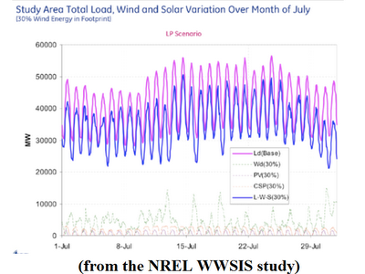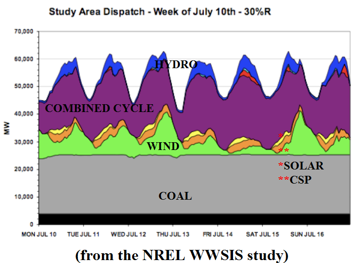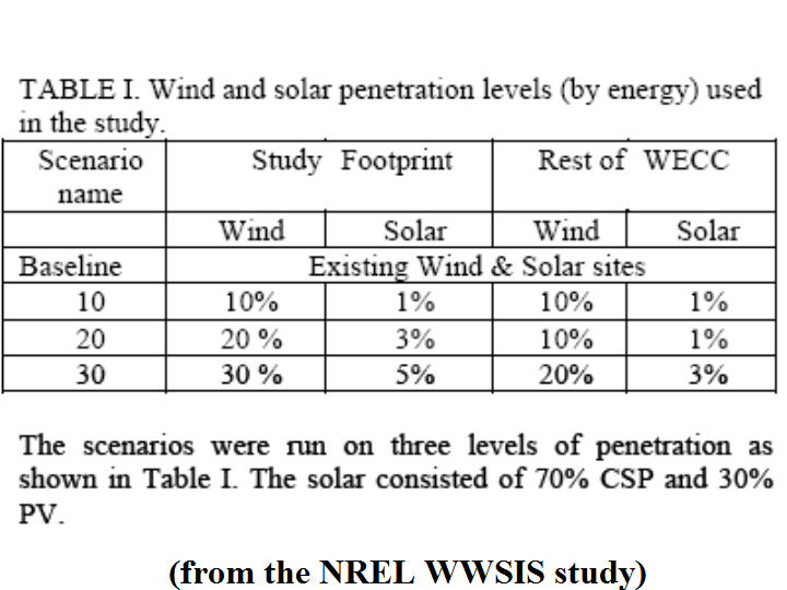 - From the “Introduction” to the study: “…The [WWSIS] study was originally established to follow onto DOE’s 20% Wind Energy by 2030 report…which did not find any technical barriers to reaching 20% wind energy in the continental United States by 2030. This study and its partner study, the Eastern Wind Integration and Transmission Study, performed a more in-depth operating impact analysis to see if 20% wind energy was feasible from an operational level. In DOE/NREL’s analysis, the 20% wind energy target required 25% wind energy in the western interconnection; therefore, this study considered 20% and 30% wind energy to bracket the DOE analysis. Additionally, since solar is rapidly growing in the west, 5% solar was also considered in this study…The goal of the WWSIS is to understand the costs and operating impacts due to the variability and uncertainty of wind, PV, and CSP on the grid. This is mainly an operations, not transmission study, although different scenarios model different transmission build-outs to deliver power. The study does not focus on the cost of generating wind or solar power, but rather the operational costs and savings due to fuel and emissions…”