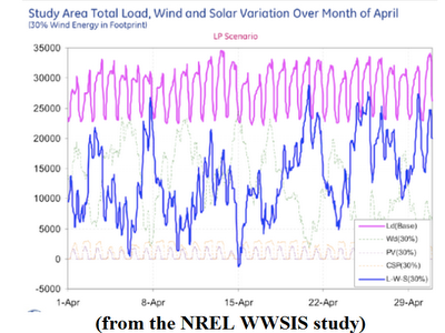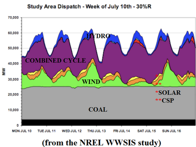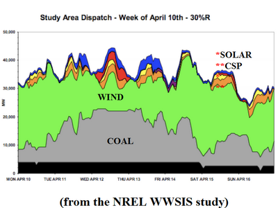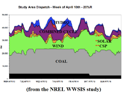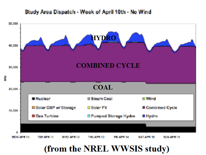 - From the study: “[One graph] shows the operation of the system going from no new renewables to 11% to 23% to 35% renewables using the IA scenario during a week in April 2006. At 35% renewables, the combined cycle units are almost completely off, gas turbine output has increased, and the coal plants are cycling significantly. Even the nuclear units are trying to cycle some, which more likely would indicate a need to spill some of the wind generation. Total generation inside the study area drops because the rest of the WECC, with 23% renewables penetration, is now reducing their need for imports from the study area. This particular week in April was a severe wind week. Other months did not have as much impact. The 5th plot shows operation for a week in mid-July for the 35% penetration scenario, which did not seem to present any operational strain on the system…”