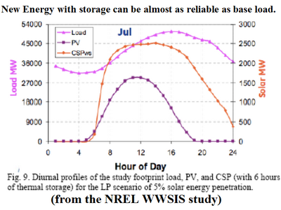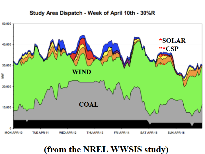 Concentrating solar power (CSP) was modeled as 100-megawatt blocks of parabolic trough plant outputs and included a hypothetical 6 hours of storage. 200+ gigawatts of concentrating solar power plants were modeled and the models are available on the web. The stored power construct was modeled so that electricity was dispatched in a typical utility load pattern (using Southern California Edison as the model). Minimal losses and a stable output were assumed.
