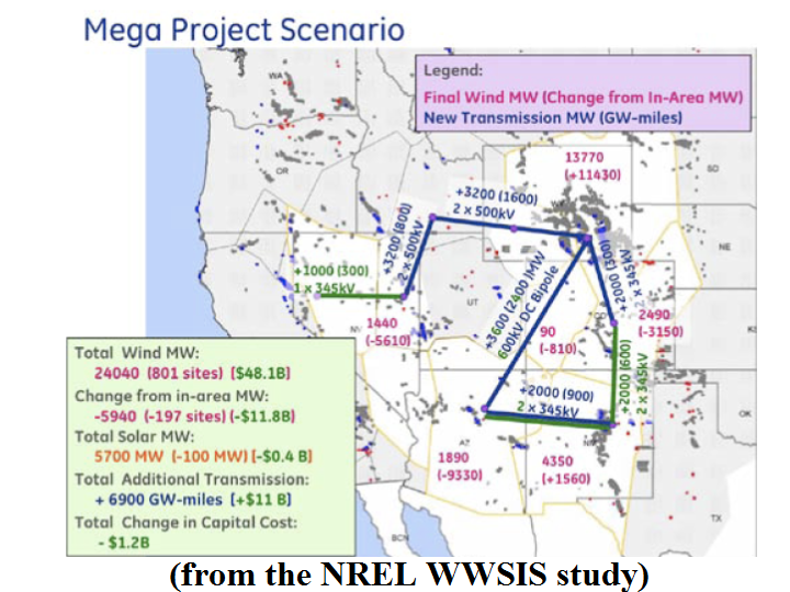 (2) A Mega-Projects (MP) scenario used higher quality but more remote resources. It assumed $1600/MW-mile transmission capital cost; $2000/kW wind capital cost; $4000/kW solar capital cost; and 1% losses per 100 miles cost penalty. It then assumed high capacity and transmission development.