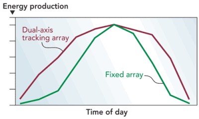 An optimally aligned dual-axis tracking system produces about 40% more power than an optimally aligned fixed-frame system [1]. Because it can tilt on both azimuth and zenith axes, a dual-axis tracking system follows the sun daily and seasonally, always positioning the array so that it optimally faces the sun.