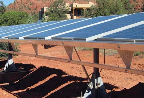 One of the drawbacks of most dual-axis trackers has been the pole-mounted design. Most tracking systems are pole-mounted in a manner similar to satellite or radar dishes. Because the array is hung from a single point, gravity is always trying to pull them over and their wind load factor is quite high. This requires heavy-duty mechanisms to hold and position the array and massive, heavy concrete foundations, heavy-duty earth moving equipment and cranes to set the array in place − all increasing the cost of installation. Another disadvantage to pole mounting is the height which can be anywhere from 12' to 20', forcing the arrays to be widely spaced to avoid shading.