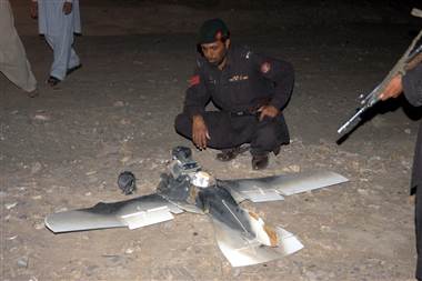 Pakistani security personnel examine a crashed US surveillance drone inside Pakistan in August.