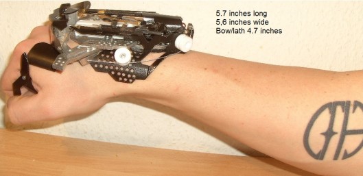 ![]() Hobbyist Patrick Priebe's latest creation is a wrist-mounted laser-sighted mini crossbow