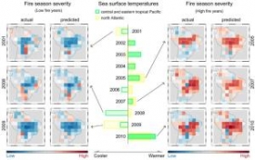 A new model uses sea surface temperatures to successfully predict fire activity in the Amazon months in advance. The diagram above shows the model predictions and a representation of the actual observations side by side. The high fire seasons of 2005, 2007 and 2010 are shown on the right of the diagram. The low fire seasons of 2001, 2008 and 2009 are shown on the left. (Credit: UC Irvine/Yang Chen) By analyzing nearly a decade of satellite data, a team of scientists led by researchers from the University of California, Irvine and funded by NASA has created a model that can successfully predict the severity and geographic distribution of fires in the Amazon rain forest and the rest of South America months in advance. Though previous research has shown that human settlement patterns are the primary factor that drives the distribution of fires in the Amazon, the new research demonstrates that environmental factors -- specifically small variations in ocean temperatures -- amplify human impacts and underpin much of the variability in the number of fires the region experiences from one year to the next. "Higher than normal sea surface temperatures in the Atlantic and the Pacific proved to be red flags that a severe fire season was on its way in four to six months," said Yang Chen, the University of California, Irvine, scientist who led the research. Chen and his colleagues found temperature changes of as little as .25°C (.45°F) in the North Atlantic and 1°C (1.8 °F) in the Central Pacific can be used to forecast the severity of the fire season across much of the Amazon. The researchers believe that unusually warm sea surface temperatures cause regional precipitation patterns to shift north in the southern Amazon during the wet season. "The result is that soils don't get fully saturated. Months later, humidity and rainfall levels decline, and the vegetation becomes drier and more flammable," said James Randerson, a scientist at University of California, Irvine who co-authored the study. To establish the connection between fire activity and sea surface temperatures the researchers analyzed nine years of fire activity data collected by Moderate Resolution Imaging Spectroradiometer instruments (MODIS) on NASA's Terra and Aqua satellites and compared the number of fires to records of sea surface temperatures maintained by the National Oceanic and Atmospheric Administration. Years with anomalously cool ocean temperatures had fewer fires, while years that experienced unusually warm ocean temperatures experienced more fires. The team also looked for and found changes in precipitations patterns as measured by the Tropical Rainfall Measuring Mission (TRMM), a satellite managed jointly by NASA and the Japan Aerospace Exploration Agency (JAXA). While a Columbia University-led study published in July of this year showed that sea surface temperatures in the Northern Atlantic could be used to forecast fire severity across the a small section of the western Amazon in Peru and Brazil, the new study considers a much broader swath of South America and takes into account how ocean temperatures in both the Pacific and Atlantic Oceans affect the continent's fires. The University of California, Irvine team also developed and validated an innovative computer model that they used to predict 2010 fire activity and could be used to forecast fire season severity in the future. The team's model successfully predicted that prolonged drought and severe fires would occur during the 2010 fire season, which is exactly what happened. "Fire activity can vary dramatically. Satellites detected about twice as many fires during 2010 as they did in 2009," said Doug Morton, a scientist based at NASA's Goddard Space Flight Center in Greenbelt, Md. who coauthored the new study. The researchers have to wait a few more months before they can determine whether the model's predictions for the 2011 fire season were also accurate. "For the 2010 season, the model successfully captured not only the severity of wildfire activity, but it also got much of the east-west spatial distribution right," said Randerson. By looking back at a full decade of data, the scientists noticed a distinctive pattern: fires in the southern and southwestern part of the Amazon were most strongly influenced by sea surface temperatures in the North Atlantic, but fires in the eastern part of the Amazon were strongly affected by sea surface temperatures in the central Pacific. A number of different types of fires occur in the region, including fires for deforestation, agricultural management, and wildfires in savannas and tropical forests. In addition to successfully predicting the overall fire severity, the model also captured the variability in forest and savanna fires from one year to the next when considered separately. The researchers are optimistic that the findings may help serve as the foundation of an early warning system for fires that would help South American authorities prepare for severe fire seasons. Morton noted an early warning system could play a critical role in helping authorities blunt the negative impacts of heavy fires years such as those the region has experienced in 2005, 2007, and 2010. Fire activity is a growing concern in the Amazon, a humid region that would experience very few fires in the absence of human activity. "Deforestation rates in the Amazon have declined significantly in recent years due to government regulations, but fire activity has been holding steady and even going up in some areas due to increases in escaped agricultural fires," said Ruth DeFries, a scientist at Columbia University, New York, and a co-author on the paper. South American fires have a particularly important impact on climate. Fires from deforestation contribute about half of the carbon emissions from deforestation in South America and a recent analysis showed that for the continent creates about 15 percent of the worldwide carbon emissions from fires. Climat