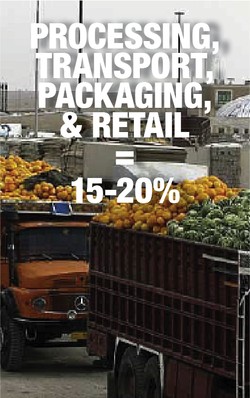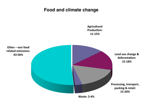 packaging and transportation, all of which generate Playing it conservative with the EU figures and extrapolating from the scarce figures that exist for other countries, we can estimate that at least 5-6% of emissions are due to food transport, 8-10% due to food processing and packaging, around 1-2% due to refrigeration, and 1-2% due to retail. This gives us a total contribution of 15-20% of global emissions from these activities.