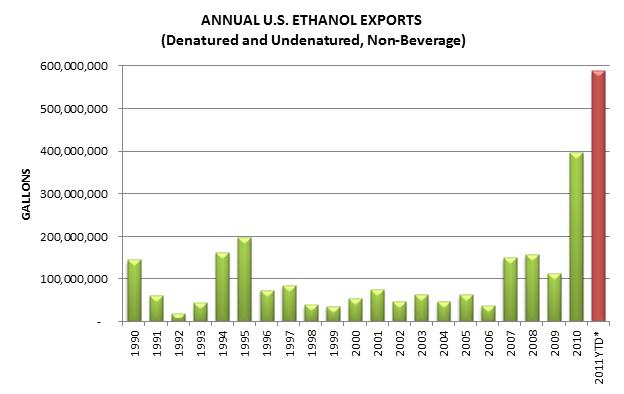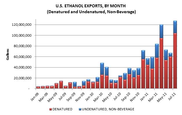 Another record month for U.S. ethanol exportsU.S. ethanol exports in July set a new monthly record, according to government data released today. Exports of denatured and undenatured (non-beverage) ethanol totaled 127.4 million gallons in July, edging out the April total of 120.1 million gallons to set a new record. July exports were nearly double the amount exported in June. Top destinations in July were Canada, Brazil, and European Union. Through the first seven months of 2011, the United States has exported 588.5 million gallons of ethanol, or roughly 7.5% of total output during that same period. Year-to-date exports in 2011 are already more than the combined total of 2009 and 2010 exports. The U.S. ethanol industry remains on pace to export 800-900 million gallons of ethanol for the entire 2011 calendar year. Exports of denatured ethanol in July topped 100 million gallons for the first time ever, coming in at 104.6 million gallons. For context, this is equivalent to the annual output of a typical large ethanol facility. Canada was the top export destination in July, receiving 33.8 million gallons of denatured product. Brazil imported 16.1 million gallons, while the United Kingdom (14.0 mg), United Arab Emirates (13.6 mg), and Netherlands (12.3 mg) rounded out the top five. Together, the top five destinations accounted for 86% of July denatured ethanol exports. Undenatured ethanol exports totaled 22.7 million gallons in July, more than triple the amount exported in June. Brazil was the top export market for undenatured product, receiving 12.9 million gallons. Other top destinations were the Philippines (3.9 mg), Netherlands (3.2 mg), and Mexico (2.6 mg). Unprecedented U.S. ethanol exports continue to be driven by the fact that corn ethanol is currently the lowest-cost motor fuel source in the world. High sugar prices and lower-than-expected sugarcane ethanol output in South America have allowed the United States to overtake Brazil as the world’s leading ethanol exporter. In fact, Brazil and Canada are neck and neck as the leading importers of U.S. ethanol so far in 2011. Canada has imported 155.5 million gallons of ethanol through July, while Brazil has imported 155 million gallons. Together, these two countries have accounted for half of U.S. exports this year. Exports of distillers dried grains with solubles (DDGS), the animal feed co-product resulting from grain ethanol production, totaled 644,525 metric tons in July, up nearly 8% from June. Mexico continued as the top DDGS export, receiving 156,400 metric tons in July. China (106,606 mt), Canada (63,707 mt), the United Kingdom (47,513 mt), and Vietnam (40,265 mt) rounded out the top five. Notably, exports to China have increased in three consecutive months after sliding significantly from late 2010 through April 2011. Year-to-date DDGS exports total 4.43 million metric tons, meaning the U.S. is on pace to export roughly 7.6 million metric tons in 2011.