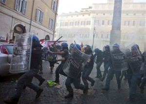 As the street protest heated up, Rome storekeepers hastily shuttered display windows. With police helicopters buzzing overhead, officers in riot gear fanned out through the squares and alleys, herding the protesters away from Parliament and from the downtown palace where Berlusconi resides. At one point an officer struck a protester on his back with a club.