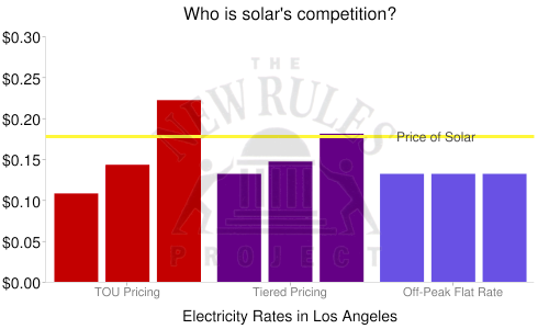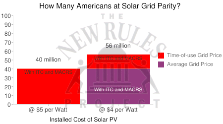 farmers and cooperatives. There are also some potential economies of operation and maintenance, although these shrink as wind projects become more ubiquitous and services are more broadly available. Is Distributed Solar Competitive at Retail? For many distributed projects, the issue is not a comparison to other large-scale power plant costs or economies of scale, but how distributed generation compares to grid electricity. The liability in such comparison is that grid electricity is mostly from old fossil fuel power plants that were paid off years ago and that generate significant pollution (including carbon emissions). Furthermore, the price of grid electricity is not static (it’s gone up 3.8 percent per year since 2000). However, many prospective customers use their existing electric bill when considering solar, so the comparison has merit. Consider a residential solar PV system installed in Los Angeles.A local buying group negotiated a price of $4.78 per Watt, equivalent to 17.9 cents per kilowatt-hour (kWh) with federal incentives. Since the average electricity price in Los Angeles is 11.5 cents, solar doesn’t appear to compete. Or does it? The following chart illustrates the difficulty in determining whether solar has reached “grid parity” (e.g. the same price as electricity from the grid). Solar & Grid Parity – What is Solar’s Competition? In Los Angeles, there are three sets of electricity prices.From October to May (off-season), all pricing plans have a flat rate per kWh and total consumption.During peak season (June to September), however, the utility offers two different pricing plans: time-of use pricing and tiered pricing. Time-of-use pricing offers lower rates – 10.8 cents – during late evening and early morning hours, but costs as much as 22 cents per kWh during peak hours.Prices fluctuate by the hour.Tiered pricing offers the same, flat rate at any hour of the day, but as total consumption increases the rate does as well.For monthly consumption of 350 kWh or less, the price is 13.2 cents.From 350 to 1,050 kWh, the price is 14.7 cents.Above 1,050 kWh, each unit of electricity costs 18.1 cents. A very rough calculation of the expected time of day production of a solar array in Los Angeles finds that the average value of a solar-produced kWh is 15.1 cents over a year. That suggests that solar power is not yet at grid parity, even with time-of-use pricing. A similar value was found when examining time-of-use pricing in PG&E’s service territory. A more robust analysis with assumptions about higher levels of on-site electricity use during peak hours could change these estimates. There are other considerations, as well. With a grid connected system, the most common policy governing the connection is net metering.It allows self-generators to roll their electricity meter backward as they generate electricity, but there are limits. Users typically only get a credit for the energy charges on their bill, and not for fixed charges utilities apply to recover the costs of grid maintenance (and associated taxes and fees). Producing more than is consumed onsite can mean giving free power to the utility company. So even if a solar array could produce all the electricity consumed on-site, the billing arrangement would not allow the customer to zero out their electricity bill.Some policies, like CLEAN contracts, eliminate this problem. Based on ILSR’s analysis, solar PV is becoming competitive with average grid electricity prices in select areas of the United States. As prices fall to $4 per Watt, solar PV projects that can take advantage of the federal tax credits and accelerated depreciation – an incentive only available to commercial operations – would compete favorably with average grid electricity prices in New York, San Francisco and Los Angeles (representing 40 million Americans). Under a time-of-use pricing plan (where prices could be 30 percent higher during hours with good sunshine, as in Los Angeles), the equation changes. An additional 16 million Americans could use solar PV (along with both federal incentives) to beat their grid electricity price at an installed cost of $4 per Watt. Even at $5 per Watt, 40 million Americans could use solar PV and federal incentives to best their utility’s time-of-use electricity rate. Falling Solar Costs Reach Grid Parity with Time-of-Use Pricing: As noted above, this grid parity calculation assumes that solar producers can use federal depreciation, an incentive worth as much as 25 percent of the project cost and only available to businesses or to homeowners who lease their solar panels.Without any federal incentives, solar PV would have to be installed at approximately $2.40 per Watt to be at grid parity for 56 million Americans. In the current environment of incentives, distributed solar is nearing a cost-effectiveness threshold, when it will suddenly become an economic opportunity for millions of Americans. To read more about democratizing the electricity system, click through: