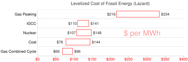 Levelized Cost of Fossil Energy (Lazard): Wind, geothermal and biomass are already less expensive than any fossil fuel energy source, when factoring in federal incentives for all three sources. Solar PV is the most expensive, but has strong prospects for lower price. Already, the average cost for German solar PV (10 to 100 kilowatt (kW) systems) has fallen to $3.70 per Watt, and some 1 MW solar PV systems in the U.S. are being installed at $3.50 per Watt, pushing the lower bound of the prices in the chart. A design charette aimed at reducing balance of system costs found that best practices could reduce solar PV installed costs by nearly 60 percent within five years, not counting further cost reductions in solar modules. At these prices, renewable energy competes very favorably against most new fossil fuel generation.