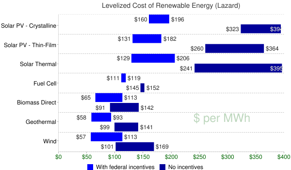 Distributed Generation The following chart illustrates the cost of power generation calculated by averaging the total lifetime cost over the total electricity generated (“levelized cost”), as estimated by the investment bank, Lazard. Federal incentives cause a significant reduction in the levelized cost of renewable energy, in the form of upfront tax credits as well as ongoing production-based tax credits. Levelized Cost of Renewable Energy (Lazard):
