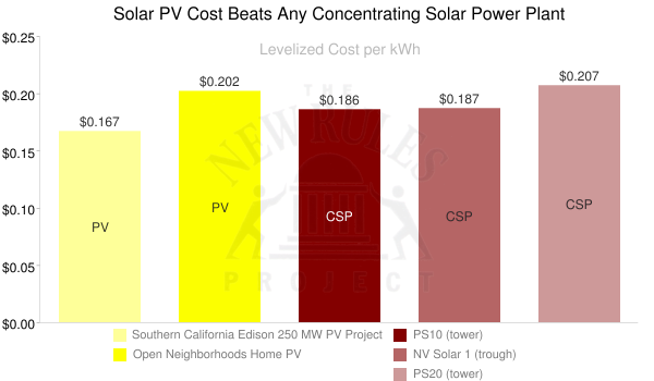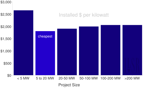 Even as renewable energy challenges fossil fuels on cost, the average size of renewable energy projects continues to defy the conventional wisdom that bigger is better. The average solar PV system in the U.S. is just 10 kW and the average wind power project is 80 MW. Wind power is often seen as the largest scale renewable energy source, and it provides an interesting lesson. While the average wind farm size has increased from 35 to 90 MW in the past 10 years, it’s almost entirely due to larger turbines (the average size has jumped from 0.71 MW to 1.74 MW in the same time frame). Wind projects don’t have more turbines, they just use larger ones. While a wind farm of larger turbines may require more total land area (to space them further apart), the amount of occupied land is relatively the same, but delivers more power. In the same fashion, solar modules have increased in efficiency and quality, allowing for greater electricity output per module.The technological advance actually reduces the need to be bigger. Because renewable energy projects can lend themselves to smaller scale and geographic dispersion, they encourage the development of a distributed grid.It’s not always the case, however. Solar Power There are two electricity technologies, solar PV and solar thermal.Solar PV directly converts sunlight to electricity, and is modular, generating power by interconnecting individual solar modules of approximately 200 Watts into arrays of 5 kW to 50,000 kW (50 MW).Solar PV costs have fallen steadily (with the exception of the 2008 silicon price shock), with modules representing about half the cost of a solar PV installation, “balance of system,” and labor and installation the remainder. Concentrating solar thermal generates electricity in several ways, with the common element of a solar concentrator (mirror or lens) used to concentrate sunlight to create heat that will be converted to electricity.Projects are generally 5 MW or larger, with several proposed projects in the U.S. and internationally of several hundred megawatts.Every commercial concentrating solar technology also lends itself to thermal energy storage, because the sun’s heat can be stored in a variety of methods (most involving molten salts) for several hours. Because solar PV power is often installed on residential rooftops at a fairly small scale, many people believe that it is inherently more expensive than its central-station counterpart, concentrating solar. The data suggest otherwise.The following chart illustrates the cost of electricity from two sample solar PV projects, one commercial and one residential, as well as the three most cost-effective concentrating solar thermal power plants. Solar PV at commercial scale comes out cheaper. Even smaller scale solar is comparable to large-scale concentrating solar. These figures do not factor in the cost of long-distance transmission, a common additional line item for concentrating solar power plants. Solar PV v. CSP Costs: These costs are supported by the