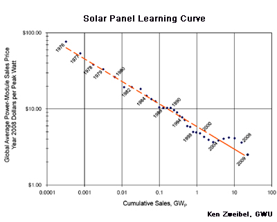 solar programs in the United States. There may be prospects for price decreases for either technology, but it’s hard to see how concentrating solar could win the price war. An oft-shared graphic (below) illustrates the solar PV experience curve, and shows how solar PV module prices have dropped as the total installed capacity has grown (a ten-fold increase installed capacity has generally reduced module prices by half). The small dots show actual module prices, and the large dotted line is the trend. Solar PV Module Cost Drops by Half for 10-Fold Capacity Increase (Ken Zweibel): The installed base of solar thermal power plants is just over 1,000 MW, split among several technologies, while solar PV is being installed at a rate of 4,000 MW per year in Germany alone.Since solar thermal projects tend to require years of planning, financing, and construction, it’s unlikely that centralized solar thermal prices will fall as rapidly as decentralized solar PV, supported by this excerpt from a recent Solar Electric Power Association report: