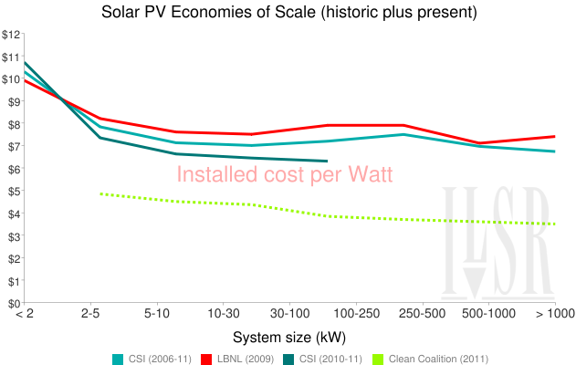 Even if solar thermal power can keep pace on cost with solar PV, the latter is much more amenable to distributed generation and local ownership and would be preferable even if the costs were similar. The second economies of scale question for solar power is big solar PV versus small solar PV.Here the data are less conclusive. The following chart provides an illustration of the installed cost per Watt for solar PV at a range of sizes.The top three lines are historical data from Lawrence Berkeley Labs (LBNL) and the California Solar Initiative (CSI). The lowest line represents installed prices reported to the Clean Coalition from their network of installers in California. Solar PV Economies of Scale: There are economies of scale for distributed solar, especially for very small (residential scale) systems. Historical U.S. data suggests that the savings from size level off beyond 10 kW, but contemporary installed data suggests that there are two breakpoints in economies of scale, at 10 kW and 1,000 kW. Data from Germany’s feed-in