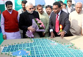The Gujarat government has agreed to purchase 933 megawatts of power from Charanka. The U.S.-based Clinton Foundation, headed by former President Bill Clinton, is partnering with the Gujarat government on the solar park. The Clinton Climate Initiative helped to select the site. "The CCI in its report for setting up the park at the north Gujarat site found that, at 5.6, solar irradiation here is highest in the country. Rajasthan has a comparable advantage, but its dusty climate discouraged CCI," said an official in the Office of the Chief Minister. Modi formally laid the foundation stone at Charanka solar park on December 30, 2010, describing the event as "the sunrise of India's future energy program."